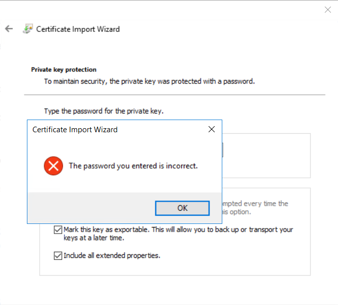 Parameters -keypbe -certpbe and -macalg are required for Windows Server 2019 compatibility. If you don’t use these parameters, you won’t be able to import the PFX file and you will get the error “The password you entered is incorrect”