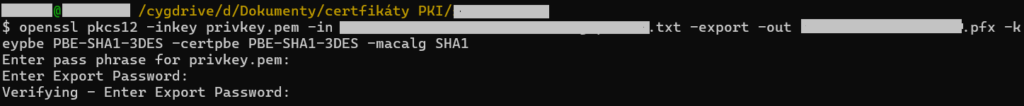 openssl pkcs12 -inkey privkey.pem -in new_cert_pub_key.txt -export -out new_cert.pfx -keypbe PBE-SHA1-3DES -certpbe PBE-SHA1-3DES -macalg SHA1